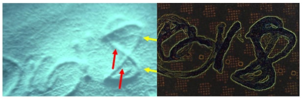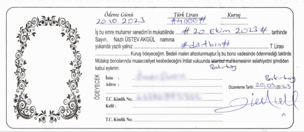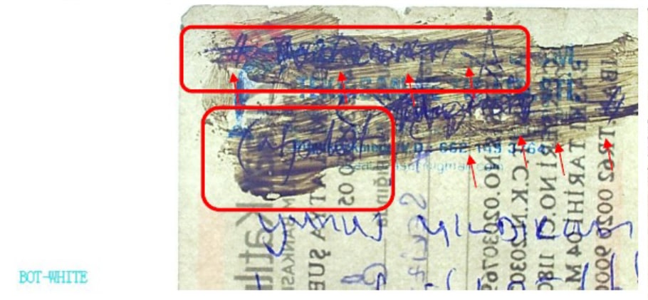 İnceleme konusu 30.10.2024 keşide tarihli ve 800.000 TL bedelli çek aslı arka yüzeyinde Forentek E10 ve HS9P adli belge inceleme cihazları kullanılarak yapılan inceleme neticesinde alınan görselde daksil veya benzeri maddeyle silinmek/kapatılmak suretiyle tahrif edilen 1.ciranta imza ve kaşesinin altında keşideci imzasına benzer bir imza ve üstü okunmayacak şekilde karalanmış yazı bulunduğu tespit edilmiştir.