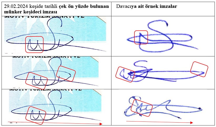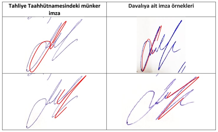 Genel şekli – tersim biçimi, imzaların başlangıç noktaları, dönüş noktalarında fazla mürekkep atımının bulunması, “U” benzeri karakterin yapılış biçimi, imzaların başlangıç bölümünde bulunan “S” benzeri karakterin tersim biçimi, istif, tersim, imzaların içerisinde kullanılan şekil ve karakterler, boyut – ebat gibi uluslararası kabul görmüş adli belge inceleme kriterleri bakımından benzer yapı ve görünümde imzalar oldukları saptanmıştır.