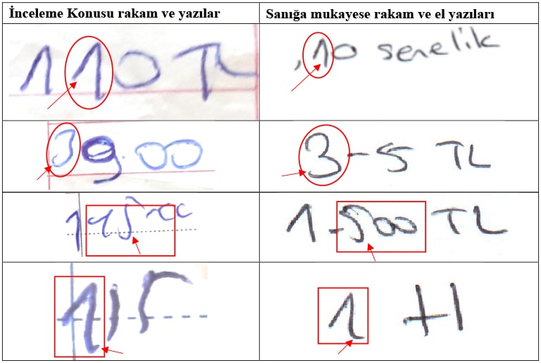 Sanığa ait medarı tatbik-örnek yazı ve rakamların göstermiş oldukları işleklik dereceleri, alışkanlıkları, tersim, istif, meyil, seyir, sürat, istikamet ve tazyik gibi grafolojik ve grafometrik özellikleri bakımından taksi fişlerindeki değişiklik / ilave yapılmış yazı ve rakamların birbirleriyle AYNI YAPI ve GÖRÜNÜMDE olmaları nedeniyle taksi fişlerindeki ilave yazı ve rakamların sanığın ELİ ÜRÜNÜ OLDUĞU özetle münker belgelerdeki rakam ve yazıların sanık tarafından yazıldıkları tespit edilmiştir.
