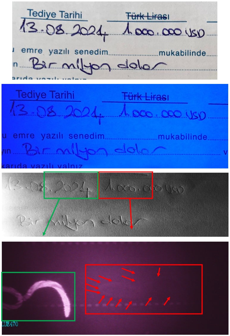 İnceleme konusu “13.08.2024” ödeme tarihli ve 1.000.000 USD bedelli senet aslı üzerinde yapılan incelemede; UV (Ultraviyole) Işık, IR (Kızılötesi) Işık, Hipterspektral ve Multispektral Görüntüleme, Video Spektral Karşılaştırma Cihazları (VSC) ile yapılan inceleme sonucunda “03” kısmının sonradan “08” şeklinde değiştirildiği,