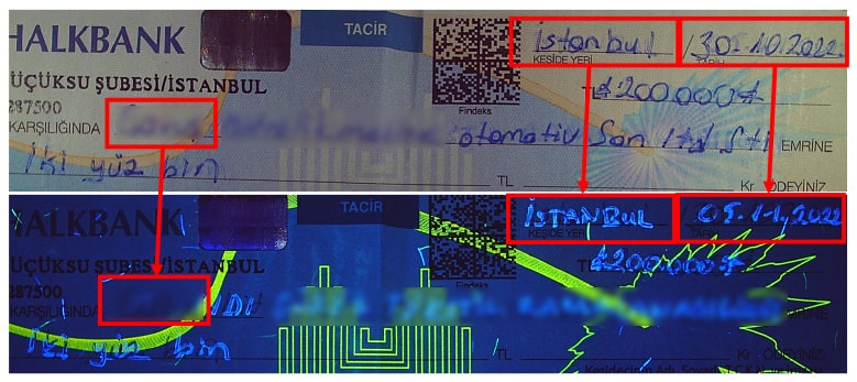 İnceleme konusu 30.10.2022 keşide tarihli ve 200.000 TL bedelli çek ön yüzde bulunan matbu alanlar dışındaki mavi tükenmez kalem ile yazılı bölümlerin kimyasal maddeler ile silinmek suretiyle daha önceki ticaret için kullanılmış çekin sonrasında yeniden piyasaya sürüldüğü tespit edilmiştir.